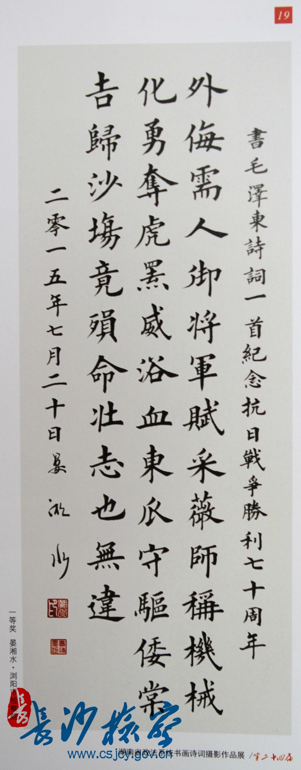 近日,湖南省政法系统书画诗词研究会发布通报,全省政法系统纪念中国人民抗日战争暨世界反法西斯战争胜利70周年书画诗词摄影作品展评选揭晓。浏阳市人民365bet网站_365bet娱乐平台_bt365.me院干警晏湘水选送的一件书法类参展作品荣获一等奖。