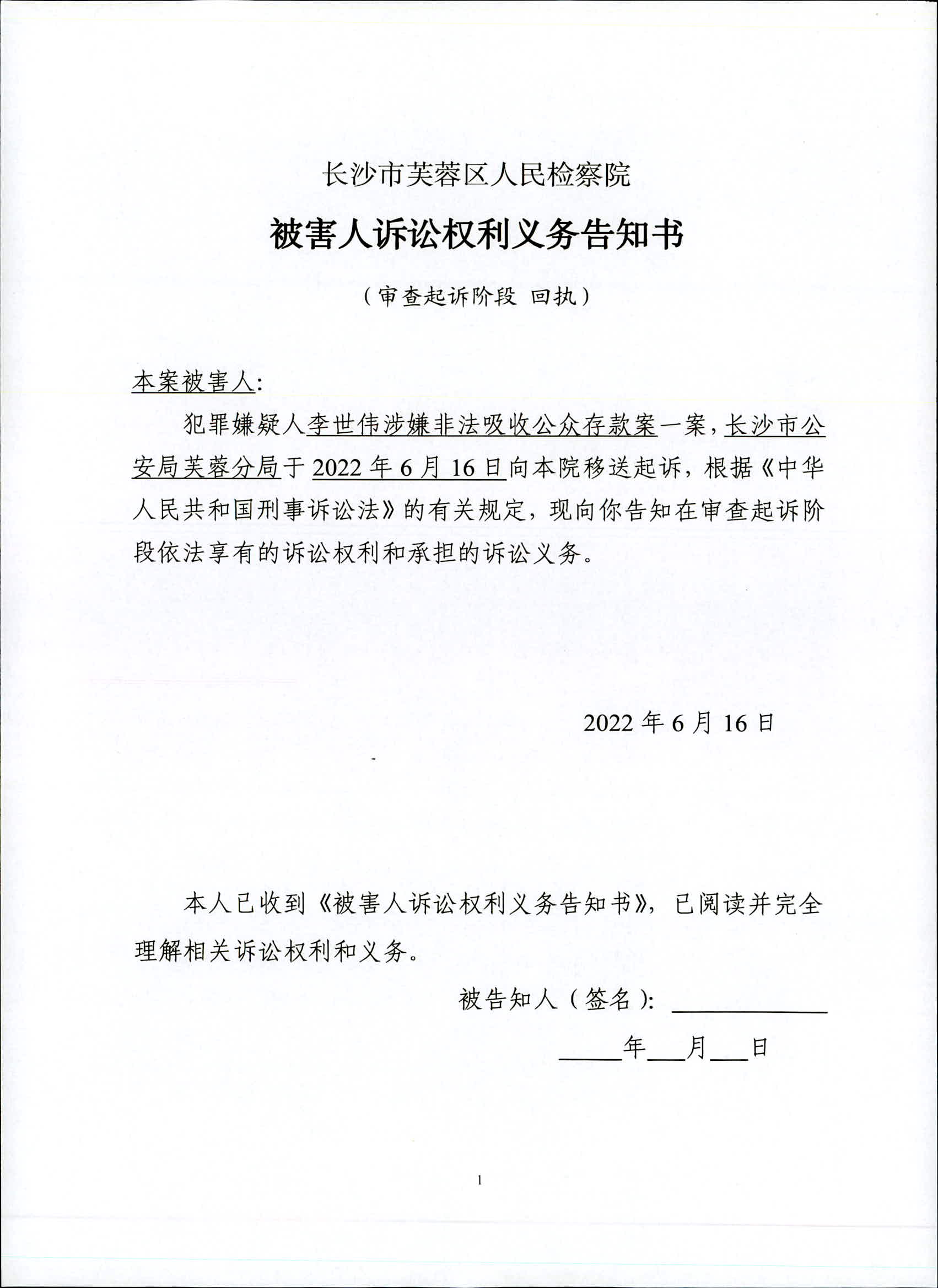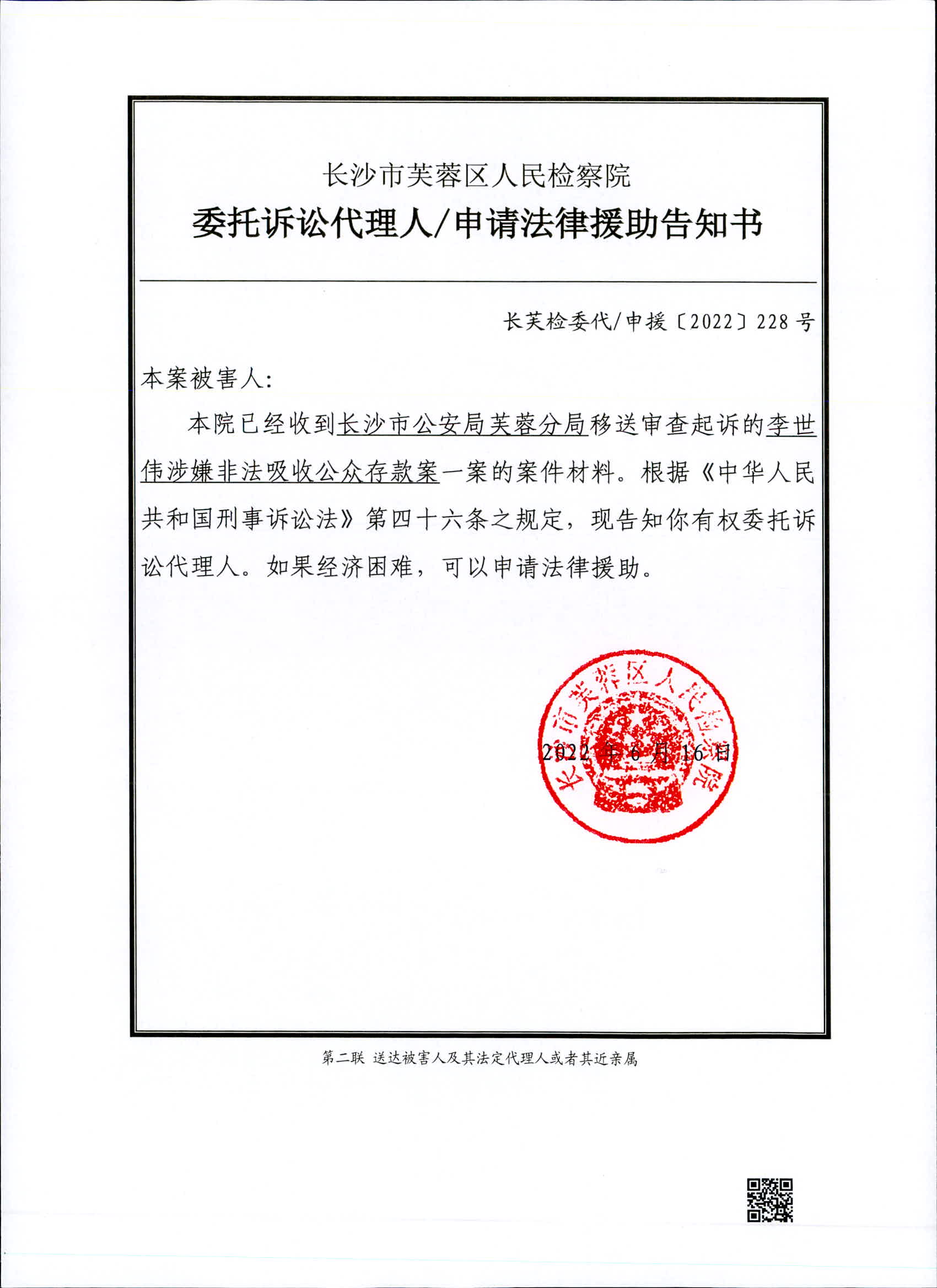 李世伟涉嫌非法吸收公众存款案委托诉讼代理人/申请法律援助告知书、被害人诉讼权利义务告知书