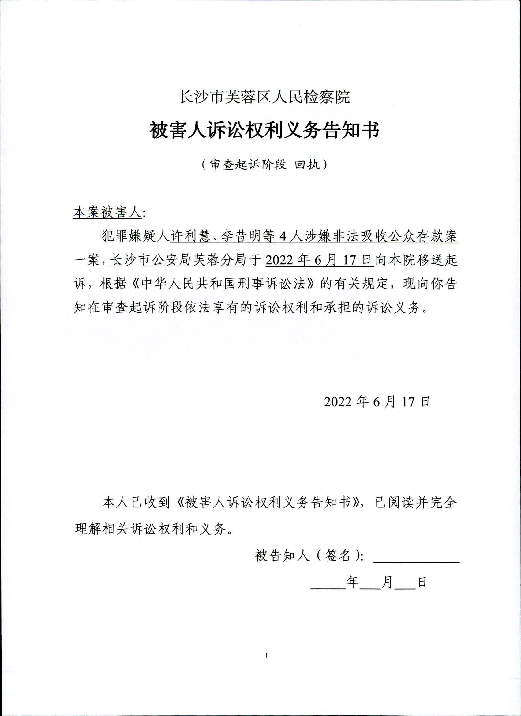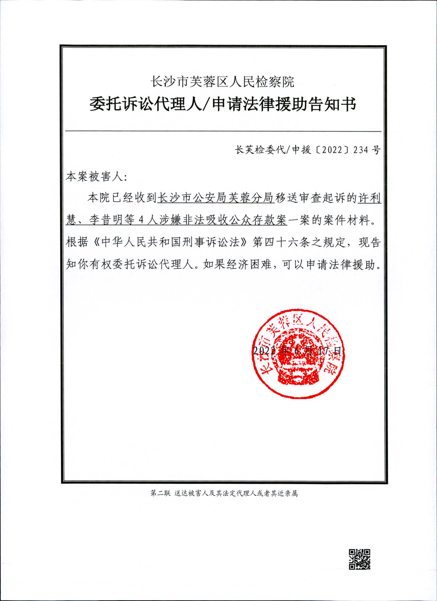 许利慧、李昔明等4人涉嫌非法吸收公众存款案委托诉讼代理人/申请法律援助告知书、被害人诉讼权利义务告知书