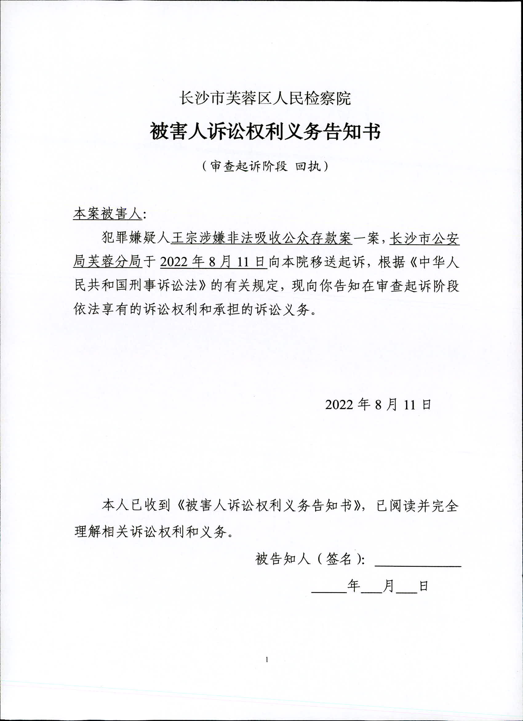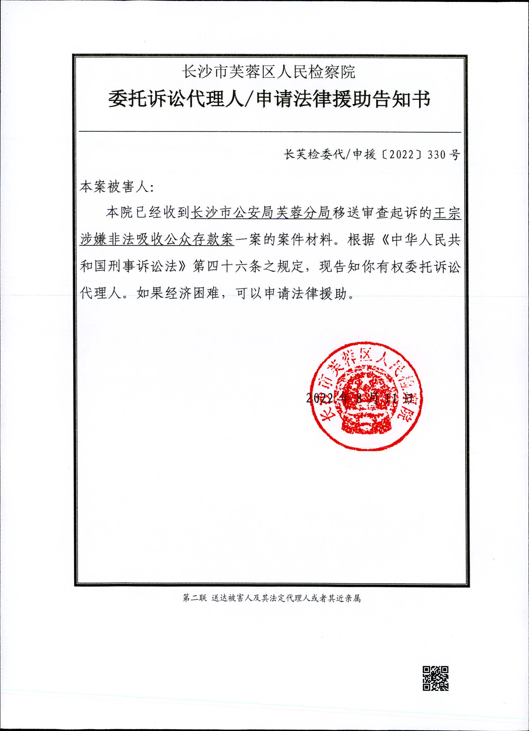王宗涉嫌非法吸收公众存款案委托诉讼代理人/申请法律援助告知书、被害人诉讼权利义务告知书