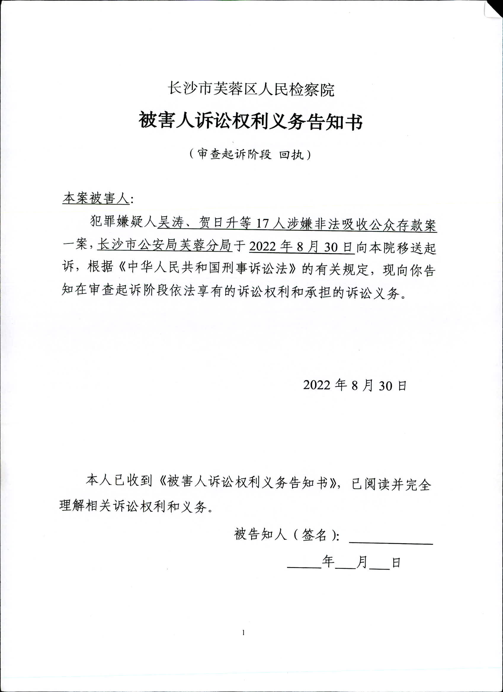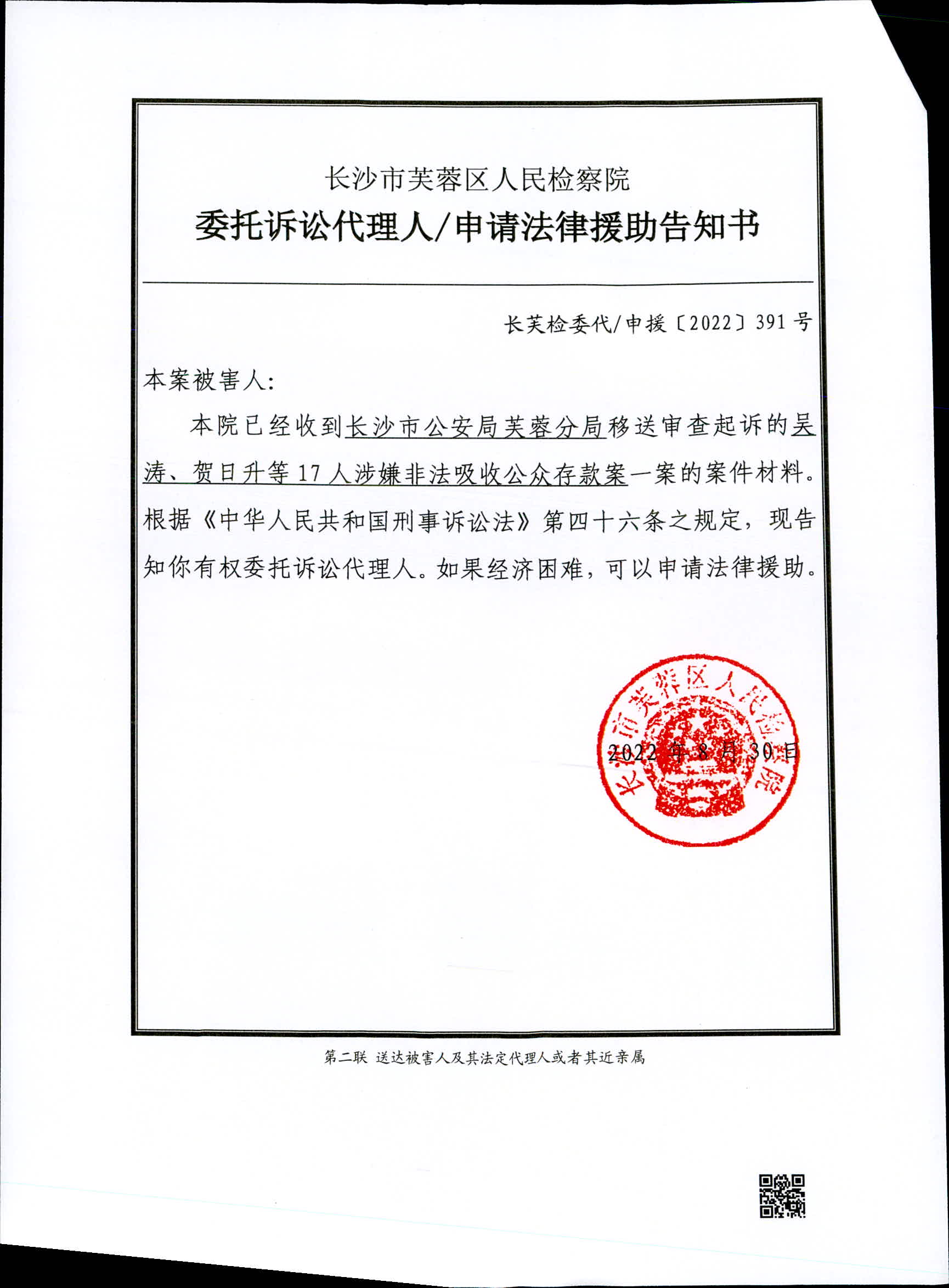 吴涛、贺日升等17人涉嫌非法吸收公众存款案委托诉讼代理人/申请法律援助告知书、被害人诉讼权利义务告知书
