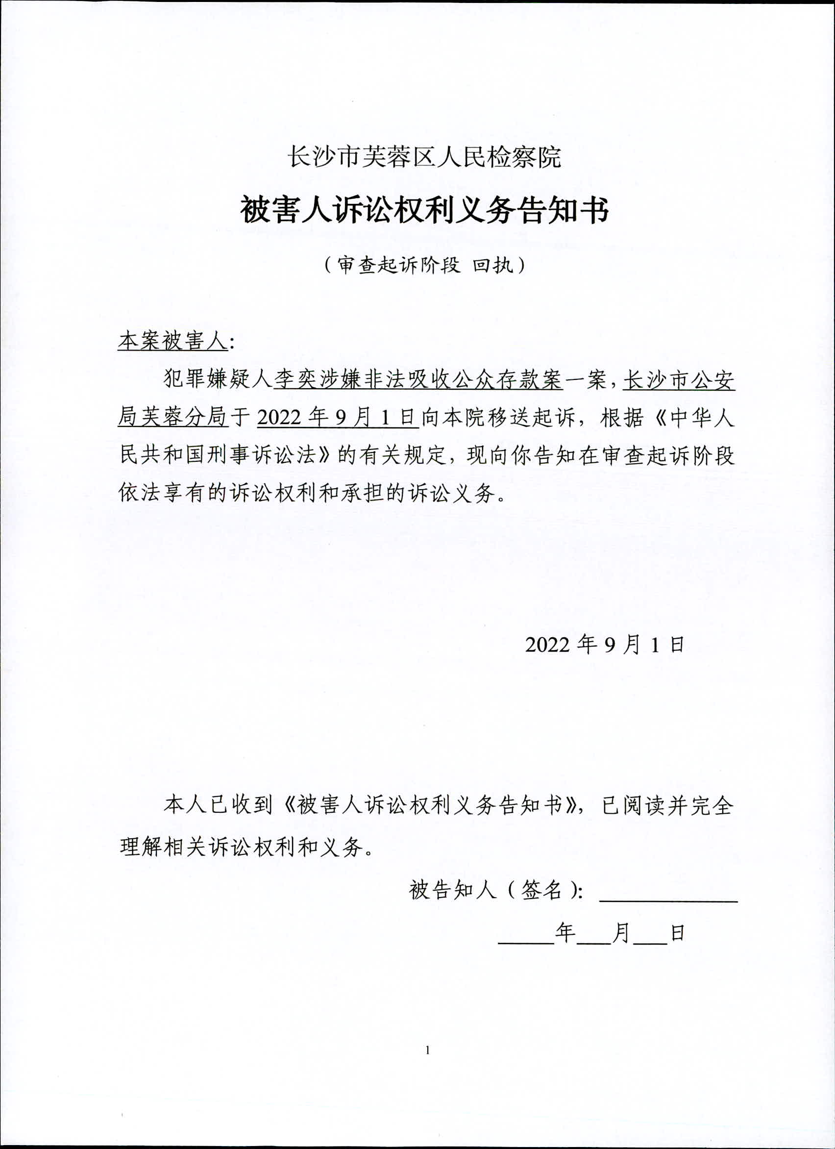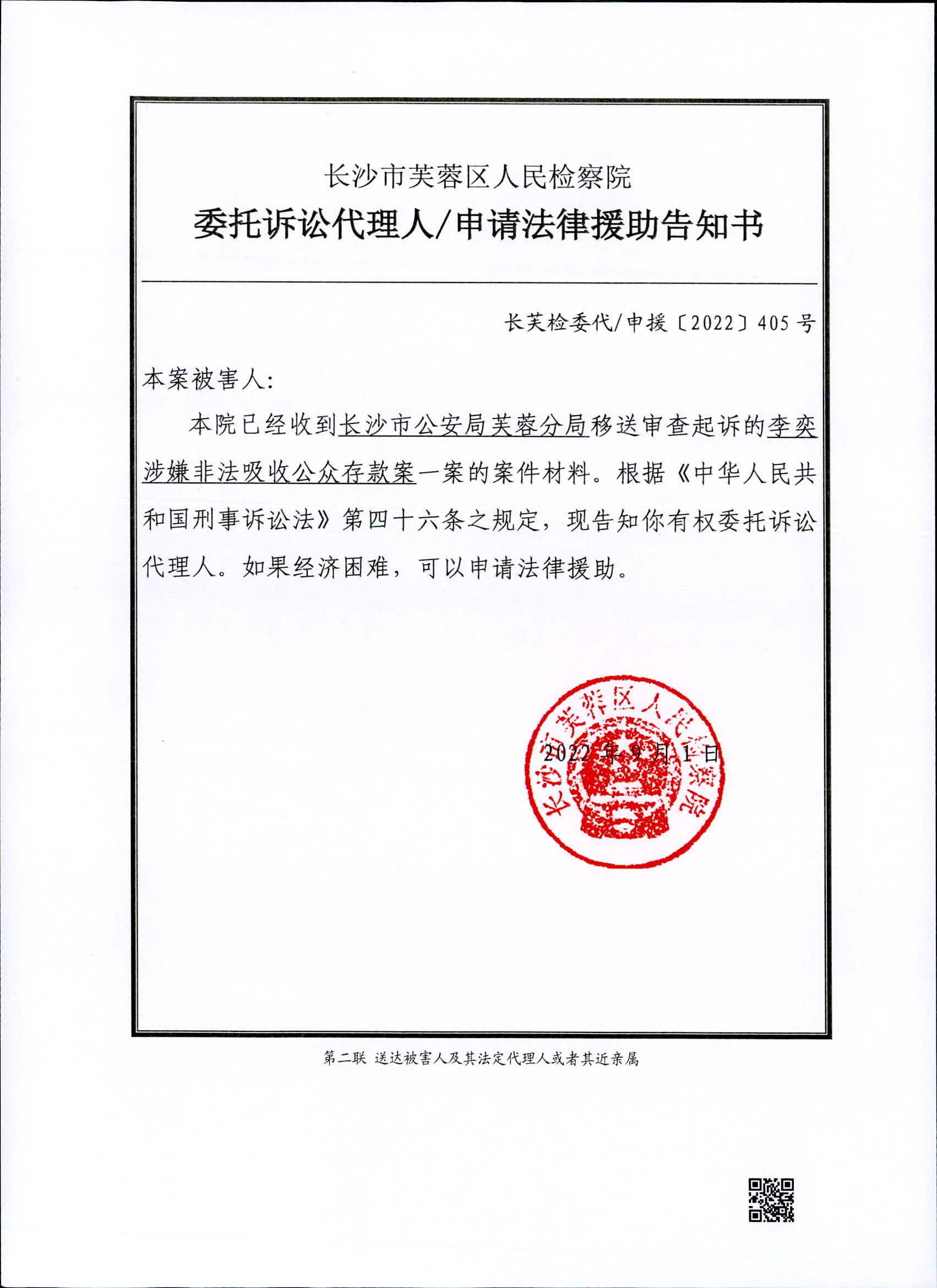 李奕涉嫌非法吸收公众存款案委托诉讼代理人/申请法律援助告知书、被害人诉讼权利义务告知书