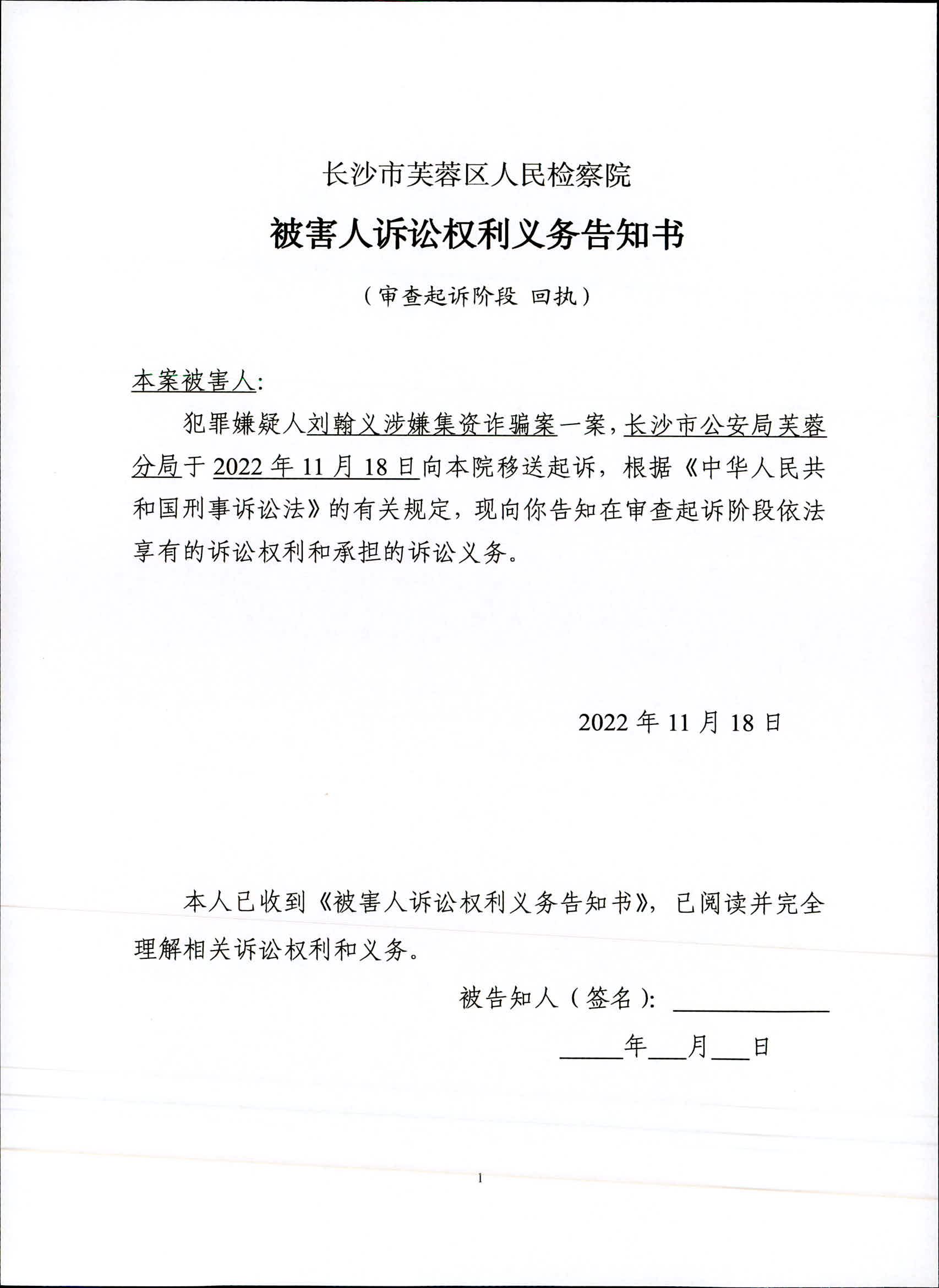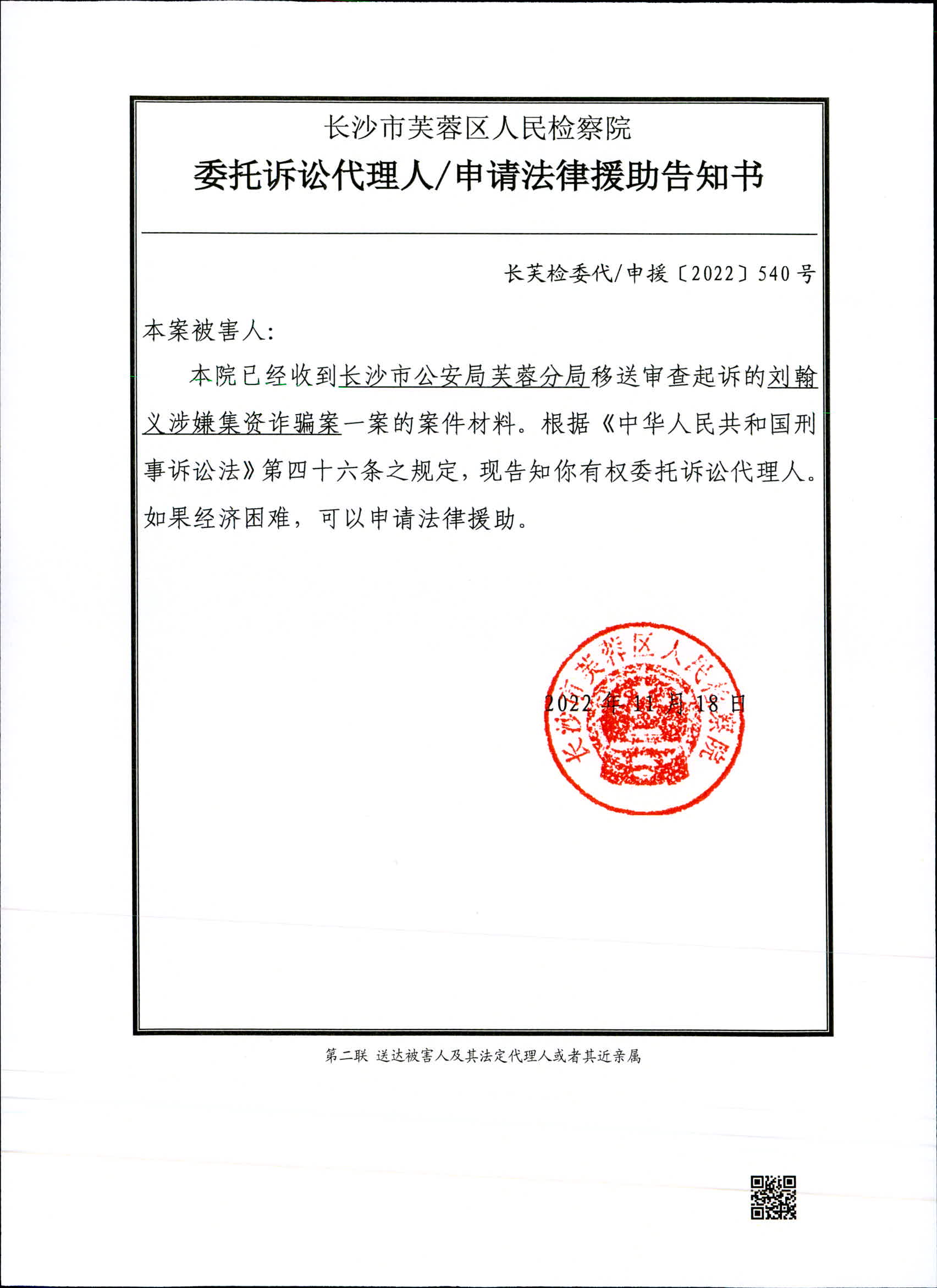 刘瀚义涉嫌非法吸收公众存款案委托诉讼代理人/申请法律援助告知书、被害人诉讼权利义务告知书