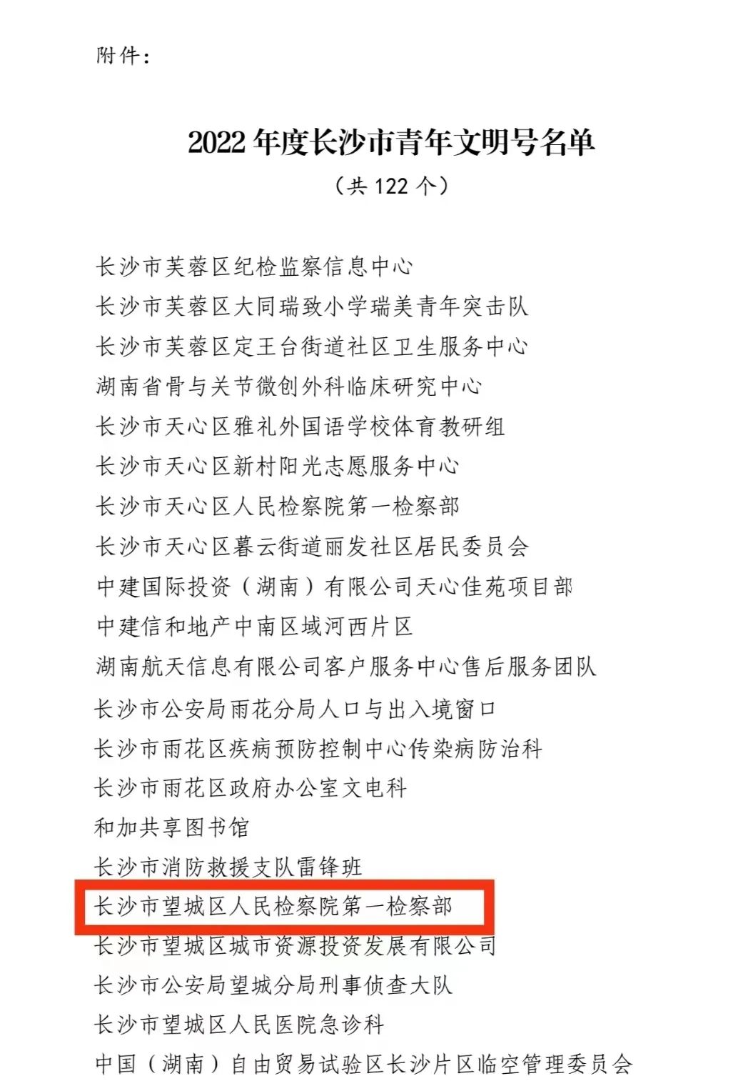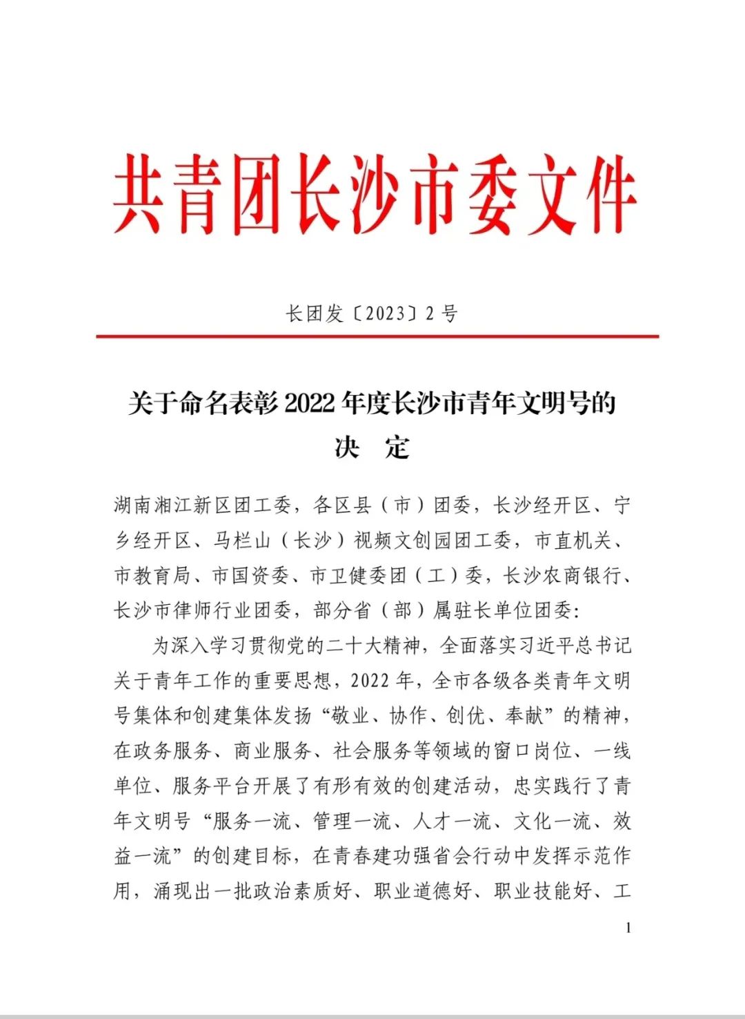 近日,由共青团长沙市委主办的”青年文明号“评选结果出炉。长沙市望城区人民365bet网站_365bet娱乐平台_bt365.me院第一365bet网站_365bet娱乐平台_bt365.me部获评2022年度“长沙市青年文明号”荣誉称号。