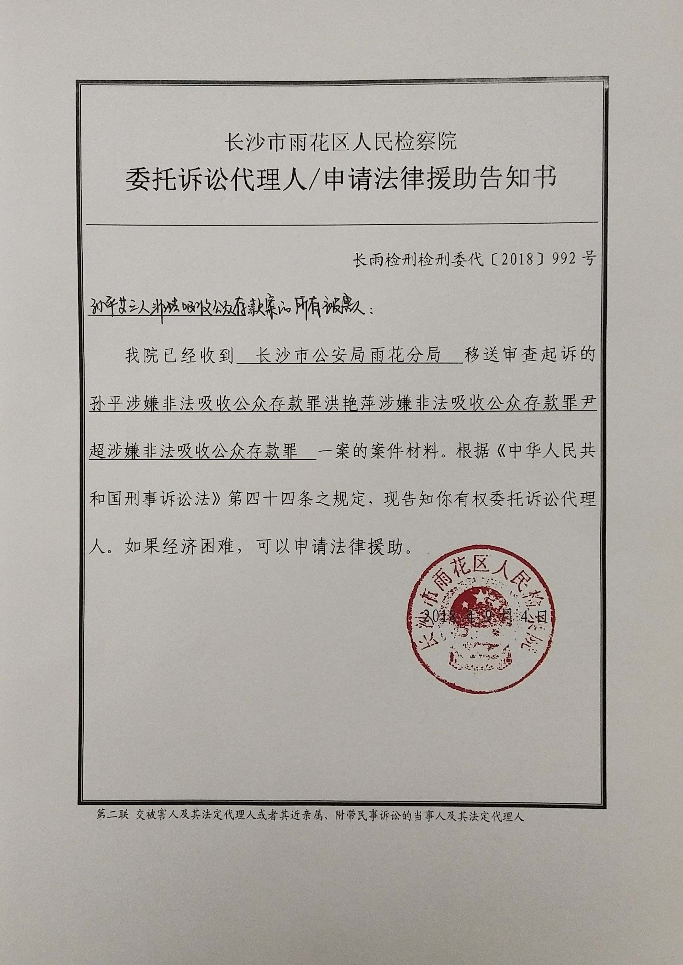长雨检刑检刑委代[2018]992号(孙平、洪艳萍、尹超非法吸收公众存款案被害人援助告知)