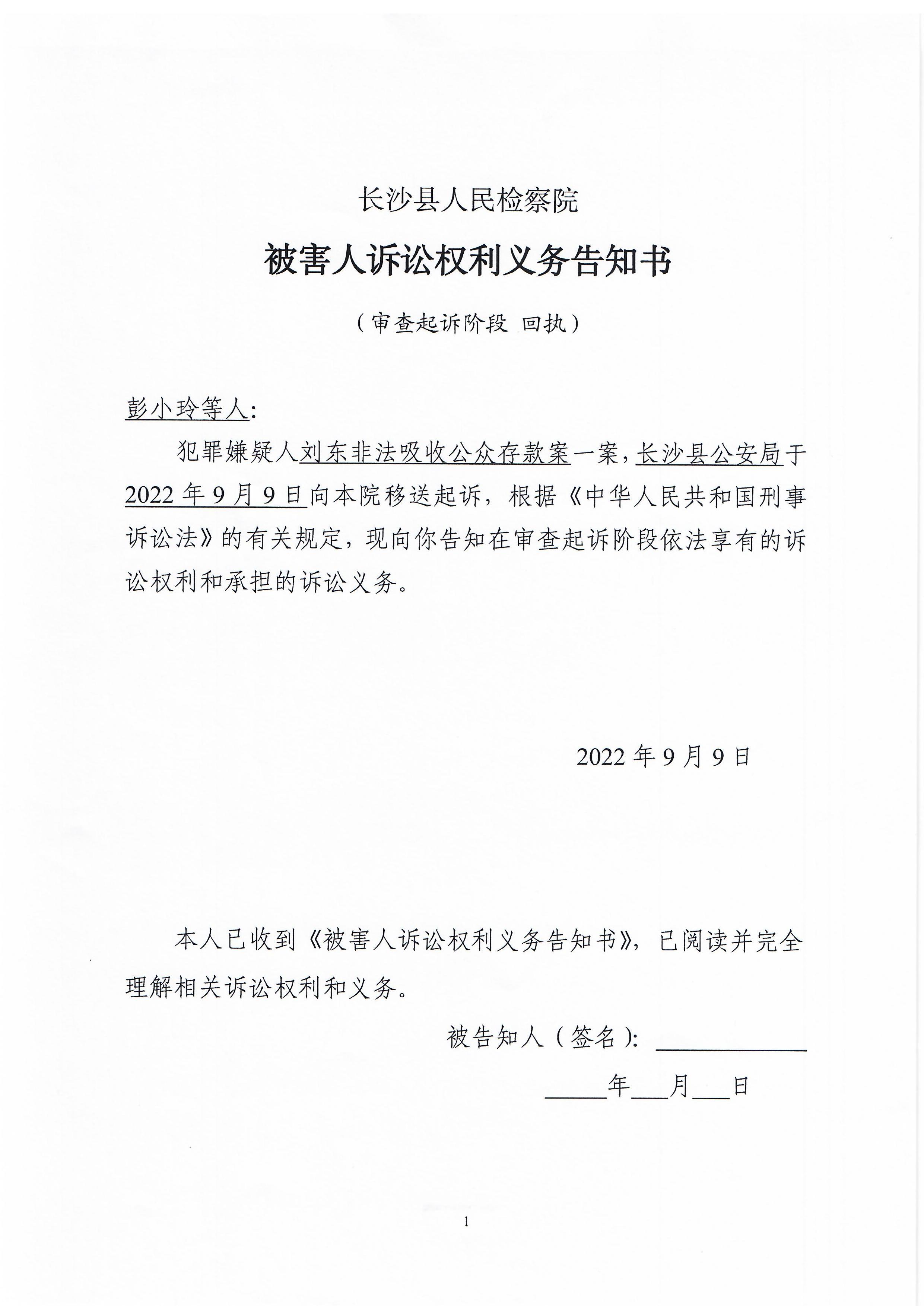 关于公告告知刘东涉嫌非法吸收公众存款罪一案被害人诉讼权利义务告知书